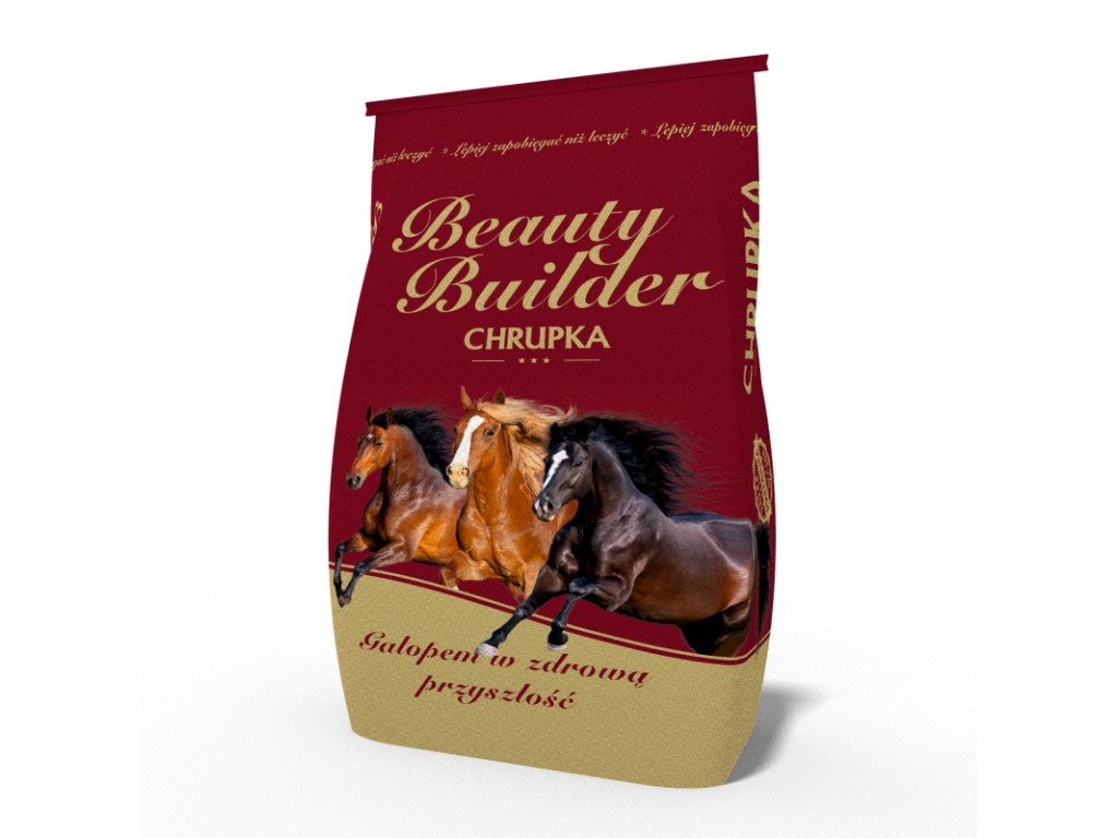 Plnohodnotné krmivo – nevyžaduje ďalšiu suplementáciu.Vysoký prísun energie pre organizmus – obsahuje extrudovanú kukuricu a pšenicu a mikronizované jačmenné vločky.Výnimočný proteínový bonus podporujúci svalovú kondíciu – obsahuje mikronizovaný hrach a extrudovaný Golden Protein, ktoré prispievajú k rozvoju a regenerácii svalov.Zlepšenie lesku srsti a kvality kopytového rohoviny – vďaka obsahu extrudovaného ľanového semena, cenného zdroja mastných kyselín omega-3 a omega-6. Ochranný a regeneračný účinok na pečeň – obsahuje jadro pestreca mariánskeho, prirodzený zdroj silymarínu.Podpora funkcie tráviaceho traktu – obsahuje kvasinky kmeňa Saccharomyces cerevisiae, ktoré Podporujú črevnú mikroflóru.Krmivo Beauty Builder je ideálne krmivo pre kone, ktoré potrebujú rýchle zlepšenie kondície, nárast svalovej hmoty a zlepšenie kvality srsti a